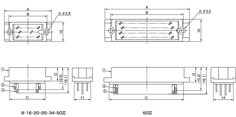 Parts No. MR-()M* Pin Count 8,16,20,25,34,50,60 Pich
