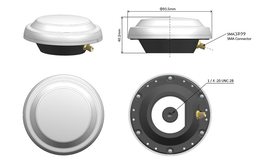1. IPX6 waterproof compatible. 2. No need for a ground board, can be attached to the pole tip with just one screw. 3. Antenna size: Φ93.5mm × 40.2mm (H). 4. Uses a waterproof SMA jack connector type. 5. The cable is available as an option.