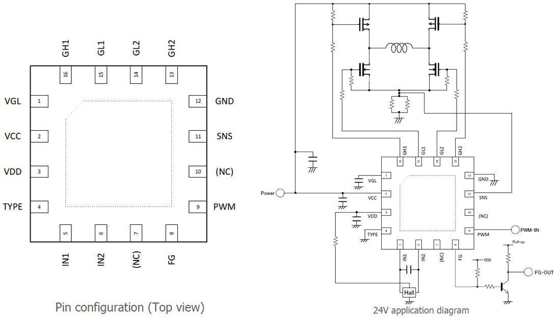 1 VGL 11V regulator output and power supply terminal for output circuit of lower external power FET gate drive 2 VCC Power supply terminal 3 VDD 5V regulator output and power supply terminals for digital and analog circuit 4 TYPE GH1, GH2 Upper external FET type selection 5 IN1 Hall signal input terminal (1) 6 IN2 Hall signal input terminal (2) 7 (NC) (No connect.) 8 FG Motor rotation signal output (FG or RD) 9 PWM Motor rotation speed control signal input terminal 10 (NC) (No connect.) 11 SNS Output current detection resistor connection terminal 12 GND GND terminal 13 GH2 Upper external power FET gate drive output (2) 14 GL2 Lower external power FET gate drive output (2) 15 GL1 Lower external power FET gate drive output (1) 16 GH1 Upper external power FET gate drive output (1) -