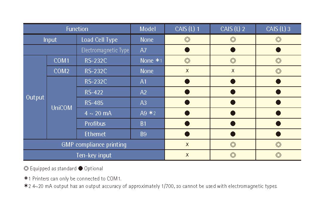 CAIS1 31250 (Standard) OIML R76 Ⅲ DC8.4V (±4.2V) (standard) 83 2000 0 27.7 4.2 27.7 1/4,000,000 max. Above 0.672μV/e (For Pind = 0.5) 20mm LCD, 7 digits, 14 segments, backlight g, kg, t, lb, status symbol AC100-240VAC(-15/+10%), 50-60Hz, 17W | 23VA max. with 2m cable -10 40 Within 85%RH (with no condensation) IP68/IP69K Stainless steel JIS SUS304 equivalent Polished finish CAISL1 31250 (Standard) OIML R76 Ⅲ DC8.4V (±4.2V) (standard) 83 2000 0 27.7 4.2 27.7 1/4,000,000 max. Above 0.672μV/e (For Pind = 0.5) 20mm LCD, 7 digits, 14 segments, backlight g, kg, t, lb, status symbol AC100-240VAC(-15/+10%), 50-60Hz, 17W | 23VA max. with 2m cable -10 40 Within 85%RH (with no condensation) IP68/IP69K Stainless steel JIS SUS304 equivalent Polished finish CAIS2 31250 (Standard) OIML R76 Ⅲ DC8.4V (±4.2V) (standard) 83 2000 0 27.7 4.2 27.7 1/4,000,000 max. Above 0.672μV/e (For Pind = 0.5) 20mm LCD, 7 digits, 14 segments, backlight g, kg, t, lb, status symbol AC100-240VAC(-15/+10%), 50-60Hz, 17W | 23VA max. with 2m cable -10 40 Within 85%RH (with no condensation) IP68/IP69K Stainless steel JIS SUS304 equivalent Polished finish CAISL2 31250 (Standard) OIML R76 Ⅲ DC8.4V (±4.2V) (standard) 83 2000 0 27.7 4.2 27.7 1/4,000,000 max. Above 0.672μV/e (For Pind = 0.5) 20mm LCD, 7 digits, 14 segments, backlight g, kg, t, lb, status symbol AC100-240VAC(-15/+10%), 50-60Hz, 17W | 23VA max. with 2m cable -10 40 Within 85%RH (with no condensation) IP68/IP69K Stainless steel JIS SUS304 equivalent Polished finish CAIS3 31250 (Standard) OIML R76 Ⅲ DC8.4V (±4.2V) (standard) 83 2000 0 27.7 4.2 27.7 1/4,000,000 max. Above 0.672μV/e (For Pind = 0.5) 20mm LCD, 7 digits, 14 segments, backlight g, kg, t, lb, status symbol AC100-240VAC(-15/+10%), 50-60Hz, 17W | 23VA max. with 2m cable -10 40 Within 85%RH (with no condensation) IP68/IP69K Stainless steel JIS SUS304 equivalent Polished finish CAISL3 31250 (Standard) OIML R76 Ⅲ DC8.4V (±4.2V) (standard) 83 2000 0 27.7 4.2 27.7 1/4,000,000 max. Above 0.672μV/e (For Pind = 0.5) 20mm LCD, 7 digits, 14 segments, backlight g, kg, t, lb, status symbol AC100-240VAC(-15/+10%), 50-60Hz, 17W | 23VA max. with 2m cable -10 40 Within 85%RH (with no condensation) IP68/IP69K Stainless steel JIS SUS304 equivalent Polished finish Click the arrow icon in the table below to switch from ascending to descending order.