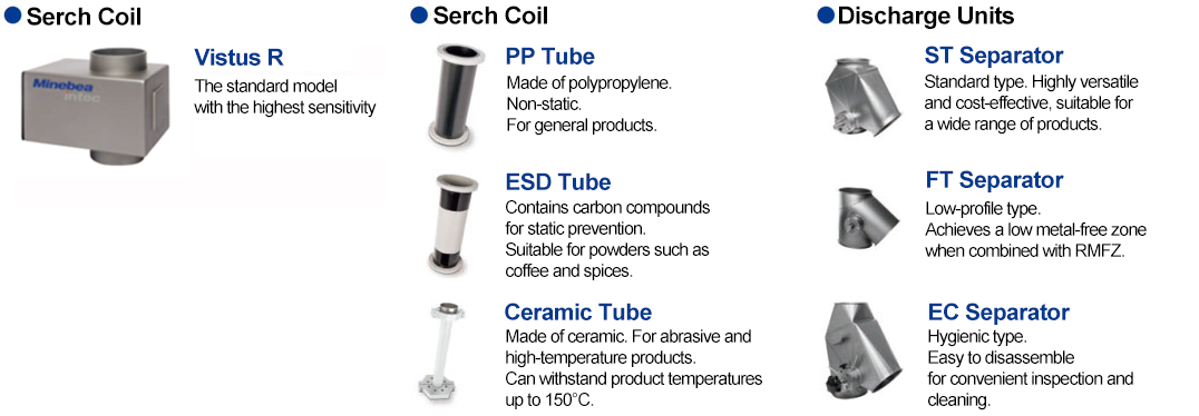 Item Vistus-R 12 Vistus-R 17.2 Vistus-R 21.6 Vistus-R 26.9 Vistus-R 34.1 Diameter of search coil 120mm 172mm 216mm 269mm 341mm Product pass-through opening 100mm 150mm 200mm 250mm 300mm Inner diameter of tube(PP) 96.8mm 152.2mm 190.2mm 237.8mm 299.6mm Inner diameter of tube(ESD) 97.4mm 141.8mm 177.2mm 221.6mm 279.2mm Inner diameter of tube(Ceramic) 80mm 100mm 150mm 200mm 250mm Throughput※1 6,000 13,500 24,000 38,000 54,000 Supply air pressure 4.0bar~10.0bar 4.0bar~10.0bar 4.0bar~10.0bar 4.0bar~10.0bar 4.0bar~10.0bar Reject method Separator using compressed air solenoid valve control Separator using compressed air solenoid valve control Separator using compressed air solenoid valve control Separator using compressed air solenoid valve control Separator using compressed air solenoid valve control Number of items in memory 50 (Option up to 200) 50 (Option up to 200) 50 (Option up to 200) 50 (Option up to 200) 50 (Option up to 200) Display method 5.7inch color touch screen 5.7inch color touch screen 5.7inch color touch screen 5.7inch color touch screen 5.7inch color touch screen Power supply AC90~260V AC90~260V AC90~260V AC90~260V AC90~260V Operating environment -10℃~+45℃ -10℃~+45℃ -10℃~+45℃ -10℃~+45℃ -10℃~+45℃ Product temperature -30℃~+55℃ -30℃~+55℃ -30℃~+55℃ -30℃~+55℃ -30℃~+55℃ Protection class IP65(Option:IP69k) IP65(Option:IP69k) IP65(Option:IP69k) IP65(Option:IP69k) IP65(Option:IP69k) Data interface TCP-IP, RS232, RS422, CAN bus, Fieldbus, Profibus TCP-IP, RS232, RS422, CAN bus, Fieldbus, Profibus TCP-IP, RS232, RS422, CAN bus, Fieldbus, Profibus TCP-IP, RS232, RS422, CAN bus, Fieldbus, Profibus TCP-IP, RS232, RS422, CAN bus, Fieldbus, Profibus Options USB printing, signal light tower, buzzer, etc. USB printing, signal light tower, buzzer, etc. USB printing, signal light tower, buzzer, etc. USB printing, signal light tower, buzzer, etc. USB printing, signal light tower, buzzer, etc. -