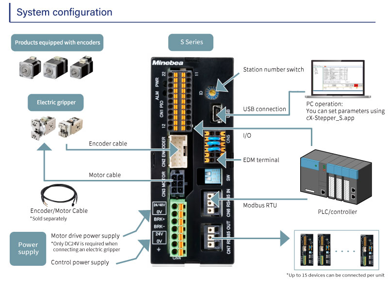This driver supports RS485 communication and also enables I/O and pulse train operation. For compatible motors, please refer to the "Motor Specifications" and "Torque/Speed Characteristics".