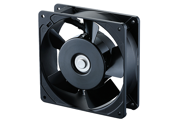 交流電圧で駆動するモーターでファン(羽根)を回転させる事により、産業機械や設備機器などの内部で発生する熱を外部へ排出し、内部を冷却します。 軸受には自社製ボールベアリングを使用しています。
