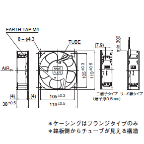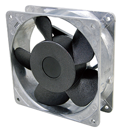 交流電圧で駆動するモーターでファン(羽根)を回転させる事により、産業機械や設備機器などの内部で発生する熱を外部へ排出し、内部を冷却します。 軸受には自社製ボールベアリングを使用しています。