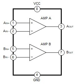 オペアンプICは、2個のオペアンプを内蔵したデュアルタイプのオペアンプです。単一電源で低いオフセット電圧を実現しています。