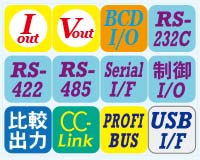 製品により、CC-Linkインターフェイス、RS-232C、RS-422/485、電流・電圧出力を標準対応