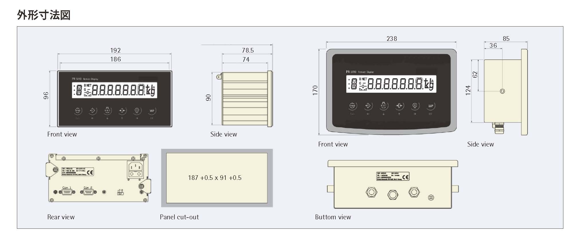 表示部 LCディスプレイ,バックライト付、7デジットおよびデシマルポイント, 文字高さ 18mm 表示単位 g , kg , t or lb 電源 100~240V AC 電源許容範囲 -15%~10% 最大許容電源電圧 85~264V AC 周波数 47~440Hz 消費電力 <5VA 使用温度範囲 -10℃~60℃ 保管温度範囲 -20℃~70℃ インターフェイス RS232/RS485 -