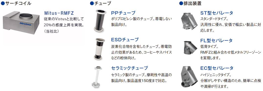 型式 Mitus-RMFZ 12 Mitus-RMFZ 17.2 Mitus-RMFZ 21.6 Mitus-RMFZ 26.9 Mitus-RMFZ 34.1 サーチコイル径 120mm 172mm 216mm 269mm 341mm 製品通過口 100mm 150mm 200mm 250mm 300mm チューブ内径(PP) 96.8mm 152.2mm 190.2mm 237.8mm 299.6mm チューブ内径(ESD) 97.4mm 141.8mm 177.2mm 221.6mm 279.2mm チューブ内径(Ceramic) 80mm 100mm 150mm 200mm 250mm 処理能力※1 6,000 13,500 24,000 38,000 54,000 供給気圧 4.0bar~10.0bar 4.0bar~10.0bar 4.0bar~10.0bar 4.0bar~10.0bar 4.0bar~10.0bar リジェクト方法 圧縮空気の電磁弁制御によるセパレーター 圧縮空気の電磁弁制御によるセパレーター 圧縮空気の電磁弁制御によるセパレーター 圧縮空気の電磁弁制御によるセパレーター 圧縮空気の電磁弁制御によるセパレーター 品目数 標準50(オプション最大200) 標準50(オプション最大200) 標準50(オプション最大200) 標準50(オプション最大200) 標準50(オプション最大200) 表示方法 5.7inch カラータッチスクリーン 5.7inch カラータッチスクリーン 5.7inch カラータッチスクリーン 5.7inch カラータッチスクリーン 5.7inch カラータッチスクリーン 電源 AC90~260V AC90~260V AC90~260V AC90~260V AC90~260V 使用環境 -10℃~+45℃ -10℃~+45℃ -10℃~+45℃ -10℃~+45℃ -10℃~+45℃ 製品温度 -30℃~+55℃ -30℃~+55℃ -30℃~+55℃ -30℃~+55℃ -30℃~+55℃ 保護等級 IP65(オプション:IP69k) IP65(オプション:IP69k) IP65(オプション:IP69k) IP65(オプション:IP69k) IP65(オプション:IP69k) データインターフェース SPC@Enterprise / RS232,422 / Profibus / Remote control / OPC DA及びopc UA SPC@Enterprise / RS232,422 / Profibus / Remote control / OPC DA及びopc UA SPC@Enterprise / RS232,422 / Profibus / Remote control / OPC DA及びopc UA SPC@Enterprise / RS232,422 / Profibus / Remote control / OPC DA及びopc UA SPC@Enterprise / RS232,422 / Profibus / Remote control / OPC DA及びopc UA オプション USBプリント, 信号灯, ブザー等 USBプリント, 信号灯, ブザー等 USBプリント, 信号灯, ブザー等 USBプリント, 信号灯, ブザー等 USBプリント, 信号灯, ブザー等 -