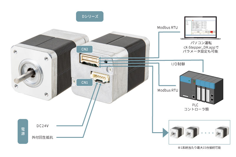 本ドライバはModbus RTU通信に対応しています。またI/O、パルス列運転が可能です。詳しくは「仕様」をご参照ください。