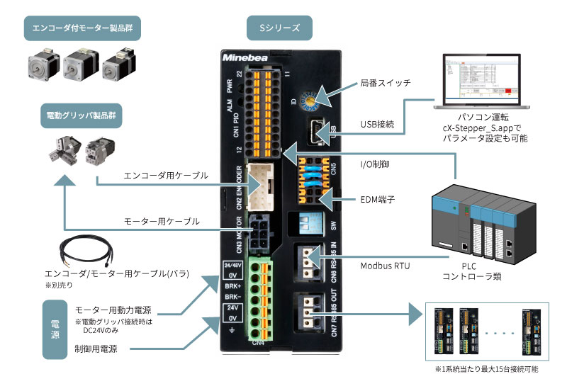ドライバは各種FAネットワークごとに取り揃えており、さらにI/O、パルス列運転は全ての機種で対応しています。本ページに記載のモーターと組み合わせが可能です。設定用のアプリも無償でご提供しています。