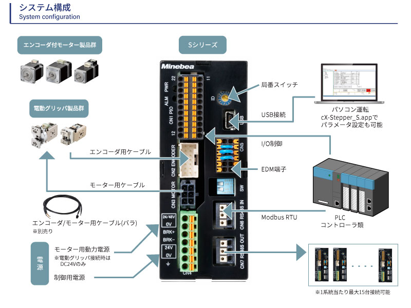 本ドライバはRS485通信に対応しています。またI/O、パルス列運転が可能です。組み合わせ可能なモーターは「モーター仕様」および「トルク・スピード特性」をご参照ください。
