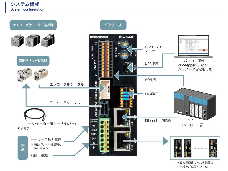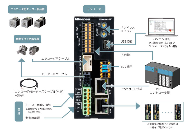 本ドライバはEthernet/IP通信に対応しています。またI/O、パルス列運転が可能です。組み合わせ可能なモーターは「モーター仕様」および「トルク・スピード特性」をご参照ください。