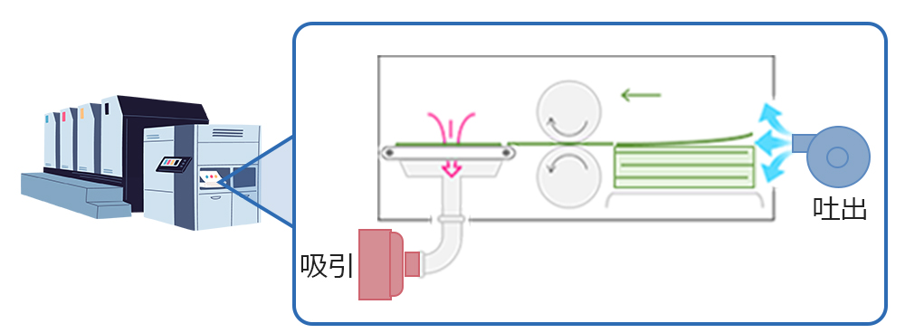印刷物を吸引、送風して(さばいて)紙を束ねる用途に使用します。