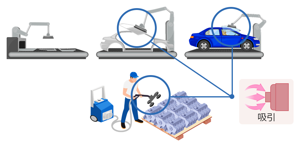 自動車生産ラインでパーツを吸着搬送します。その他重量物での搬送にも使用します。